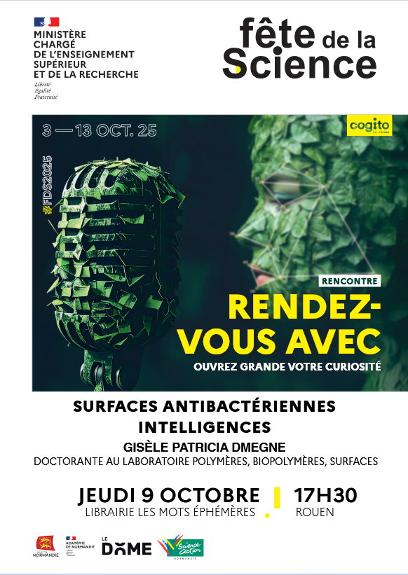 Nous recevrons Gisèle Patricia Demgne Foubi, doctorante au laboratoire Polymères, biopolymères et surfaces (PBS), qui viendra présenter ses travaux sur les surfaces antibactériennes intelligentes. Ces nouvelles surfaces dites « auto-protectrices » sont conçues à partir de matériaux naturels et ont la capacité de limiter elles-mêmes la prolifération des bactéries. L’objectif est clair : prévenir les infections et réduire le recours massif aux produits ménagers désinfectants.